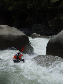 He should know. Our fearless leader has been at the forefront of local creeking exploration for the last 20 years. If he hasn’t been there, he’s talked to the sickbirds that have. His first-hand knowledge trumps that of the Chasing Jaguars guidebook, which I brought for the weekend because Ferdinand has plans to go to a wedding. Joe and I are hoping to persuade him to do the noble kayaking thing and bail. We’re both pretty sure that he’s testing us today, and as we charge into the first drops of the Rio Candelaria, I’m quite stoked to be the guinea pig.